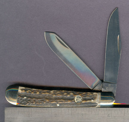 KC-27 This classic Trapper style knife is a must have for any collection. It has great rugged appeal with the Genuine Stag handle. The quality of this knife is unmatched due to the fact that it is a prized brand name of Kissing Crane from the internationally known town of Solingen, Germany. The inlay shield is the recognizable kissing crane crest. With its quality stainless steal blades, sought after style and handle, and perfect Mint condition, you can’t pass this one up!