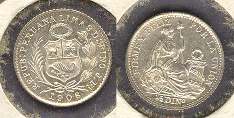 Item Number: Peru-23 Almost Uncirculated+ 1/2 Dinero #206.2 .900 Silver Lima Mint. Clashed dies$20.00