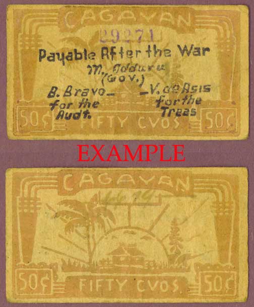 Item Number: PHIL GU-26E Fine or Better - #S185 ND Cagayan Province Small size note approximately 3" X 1-3/4" - Brown ink with manilla paper and black overprint. Small hut and trees.$5.00