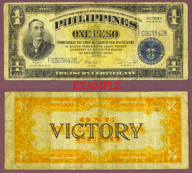 Very Good or Better - #94 ND Victory Series No. 66 twice on face of note instead of date, blue seal. Signed by J. Hernandez and S. Osmena. Back is orange with black overprint VICTORY in large letters.
