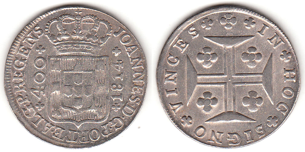 Item Number: PORT-32 Extremely Fine - 400 Reis KM#331 Silver - Approximately 35.5 MM. Nice coin with no problems. JOANNES...ET ALG REX.. and Crowned arms on obverse. Reverse: Cross of Jerusalem.$120.00