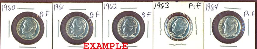 Item Number: RD-69E You will receive 5 different - 90% Silver Proof Roosevelt dimes dating 1960 thru 1964. The coins will grade Proof-65. This would make a great start or addition to a nice Roosevelt dime set. Save 20% off singles price.$30.00