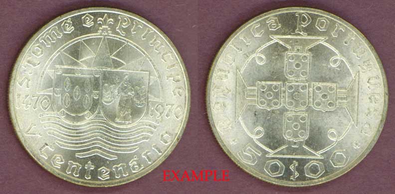 Item Number: St.Thom-23E Uncirculated - 50 Escudos KM#21 .6500 Fine Silver. One Year Type Coin! 500th Anniversary of Discovery. Mintage of 150,000$50.00