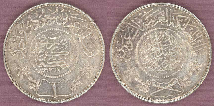 Item Number: SAUD-25 About Uncirculated - 1 Riyal .9170 Fine Silver KM#18 Three Year Type Coin made in 1947.$30.00
