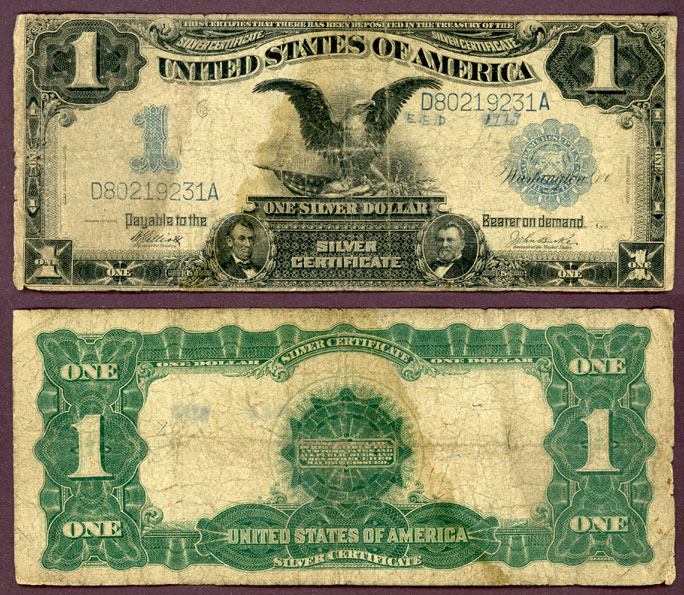 Item Number: LSC-74 Very Good - FR-234 Elliott/Burke - Writing in ink under right serial number with stain. Black Eagle US Large Size Silver Certificate. Portrait of Lincoln and Grant. $120.00