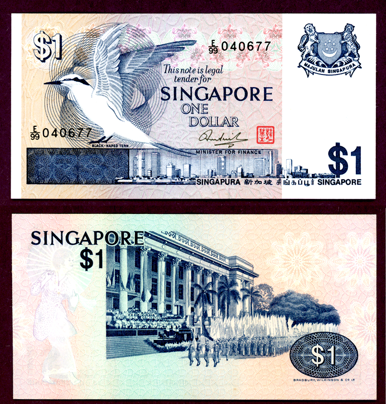 Item Number: SING-50 Uncirculated - #9 Front is Blue-Black on multicolored underprint with Black-napped tern at left. Arms at upper right. Back National Day Parade passing large building at center. Watermark: Lions Head$5.00