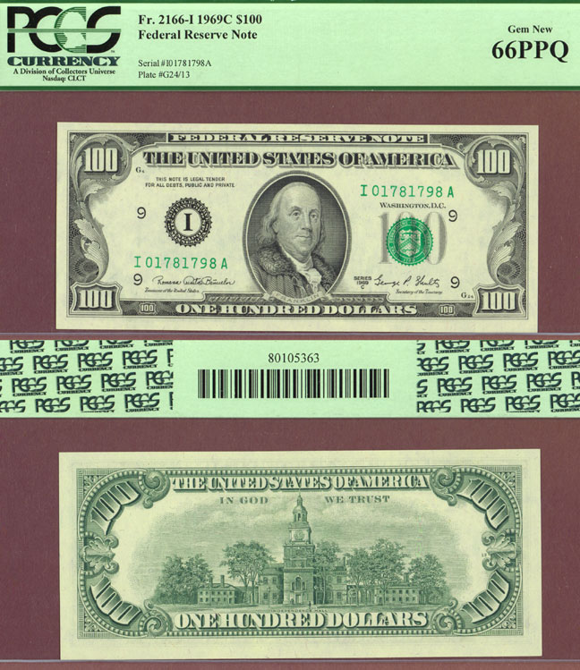 Item Number: SFRN-246 PCGS GEM New 66 PPQ - Fr-2166-I Banuelos-Shultz - Great eye appeal and wide margins on this GEM+ note. This is the Minneapolis district which had the lowest printing by far of all districts for this series. Only 512,000 printed. $250.00