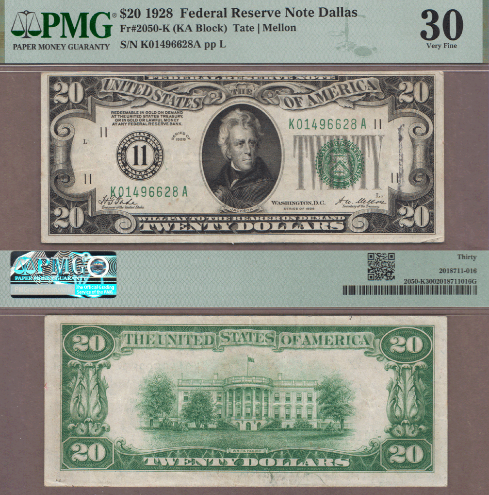 Item Number: SFRN-367 PMG Very Fine 30 - FR-2050-K Tate/Mellon - Clean no problem note from the tough Dallas District. Early small size Federal Reserve note with numerals in federal reserve seal. $275.00