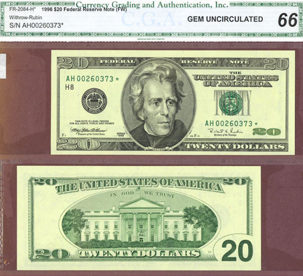 Item Number: SFRN-34 CGA Gem Uncirculated-66 The lowest printing of the entire series with Only 640,000 *STAR* notes made. Saint Louis Withrow/Rubin Printed in Fort Worth FR-2083-H*$170.00
