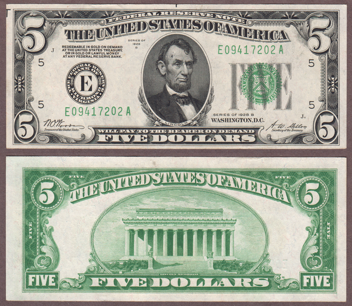 Item Number: SFRN-324 Crisp Uncirculated - $5 FR-1952-E Richmond District Woods/Mellon - Well margined early small size federal reserve note "Redeemable in gold on demand".$95.00