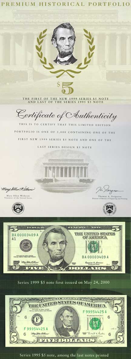 Item Number: SFRN-149 Gem Uncirculated - Limited to only 5,000 sets, this beautifully designed presentation package houses one of the first 1999 $5 issued along with the last of the 1995 $5.$175.00