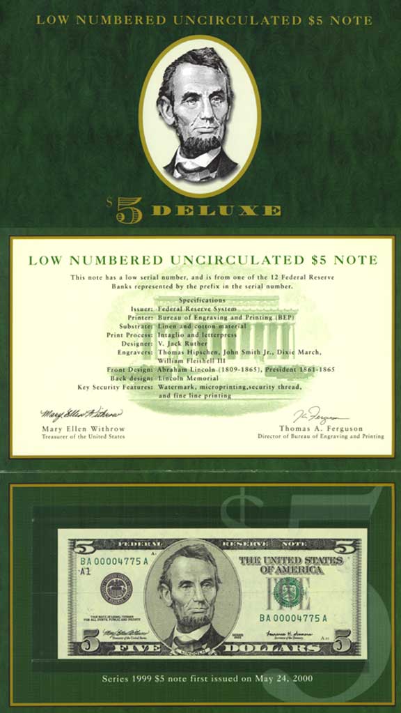 SFRN-138 Choice/Gem - Series 1999 $5 Deluxe Notes were issued with serial numbers below 5000 this note is BA00004775A. Offered for sale by the BEP over the 2001 Holiday Season, these sold out years ago.