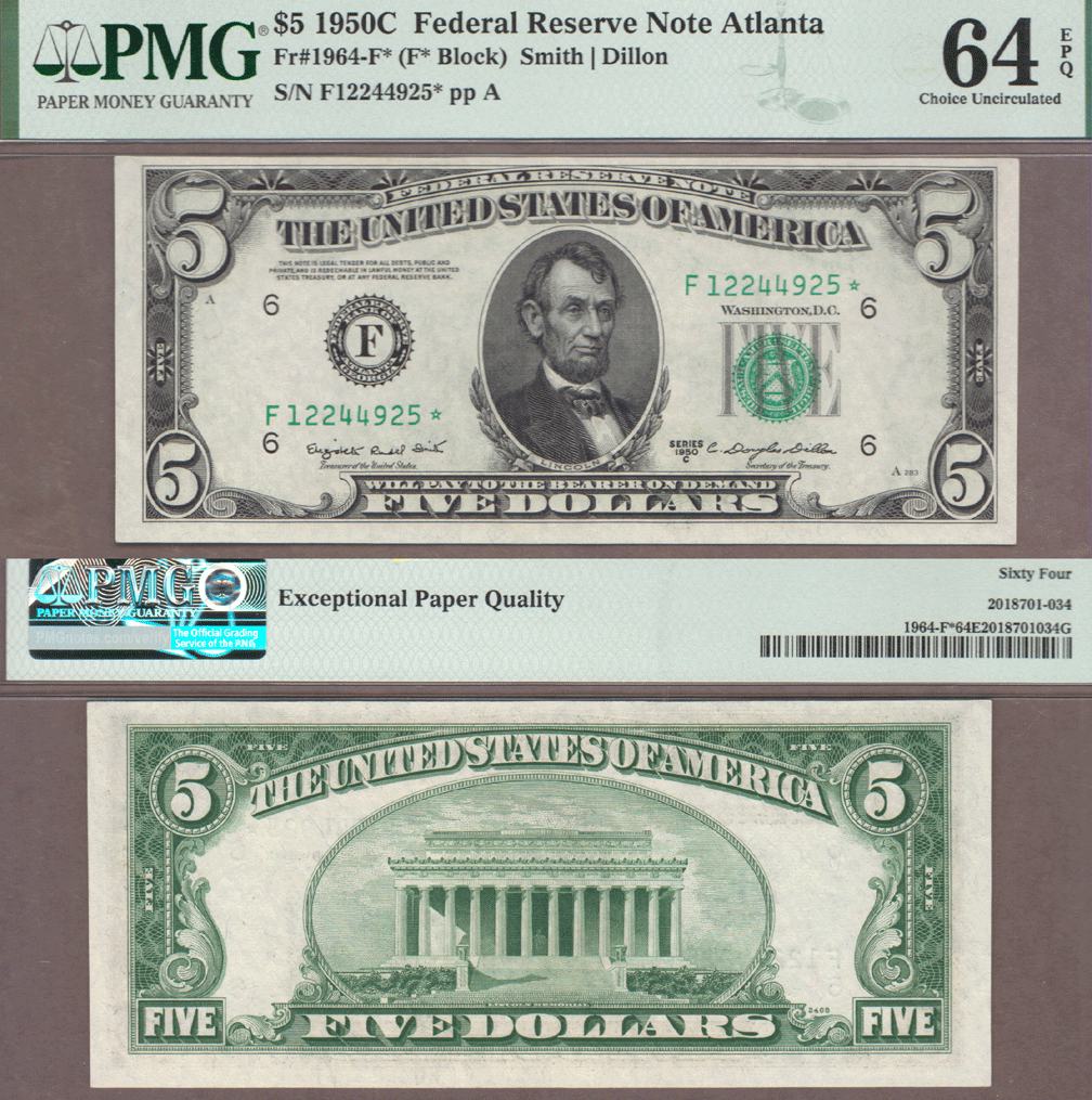 Item Number: SFRN-345 PMG Choice Uncirculated 64 EPQ - FR-1964-F* STAR NOTE Smith/Dillon - From the Atlanta F District. Near GEM note with "EPQ" Exceptional Paper Quality. $90.00