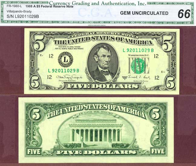 Item Number: SFRN-146 CGA Gem Uncirculated 66 - San Francisco District Villalpando/Brady Made in Washington DC. Beautiful high grade GEM with Radar serial number.$75.00