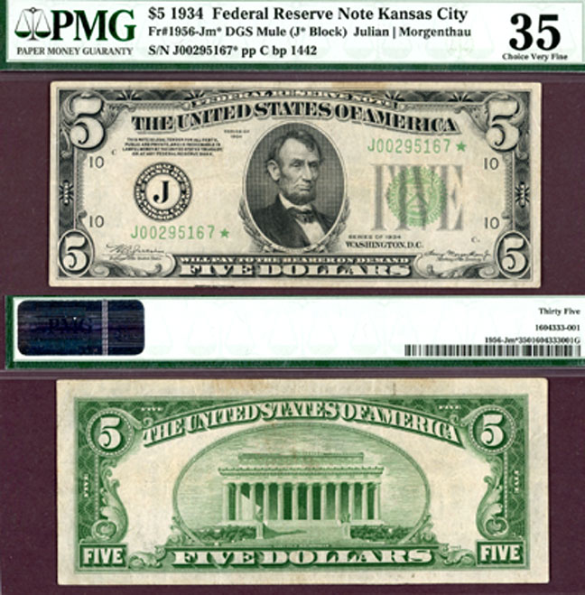 PMG Choice Very Fine 35 - FR-1956-J* Mule Dark Green Seal Kansas City District Julian/Morgenthau. Original high grade VF example of this rare Kansas City mule STAR note. The Schwartz-Lindquist book reports only 2 examples known and lists this star note at $300 in VF..