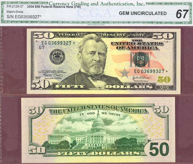 Item Number: SFRN-144 CGA Gem Uncirculated 67 - FR-2129-G* Marin/Snow - Great looking high end GEM *STAR* note. Chicago $180.00