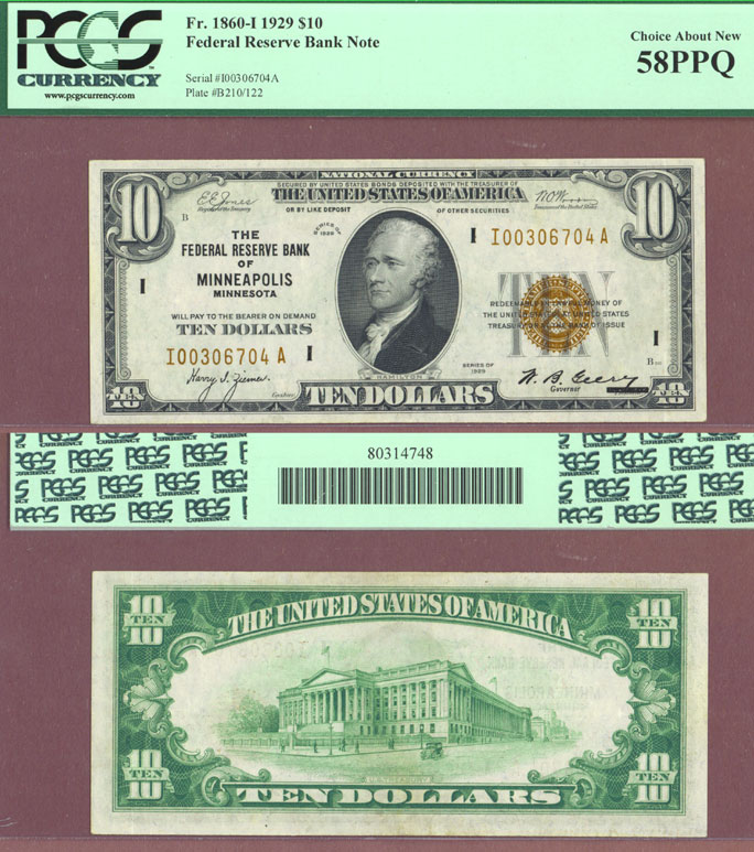 Item Number: SFRBN-58 PCGS Choice About Uncirculated 58 PPQ - 1860-I - A beautiful high grade note from the Minneapolis district with Premium Paper Quality. Tougher Minneapolis district only 588,000 notes made. $350.00