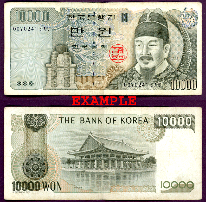 Item Number: KOR-52E Fine or Better - #50 - Front is Dark Green on multicolored underprint with portrait of King Sejong at right. Back is Green with Kyonghoeru Pavilion at center. Watermark: King Sejong$10.00
