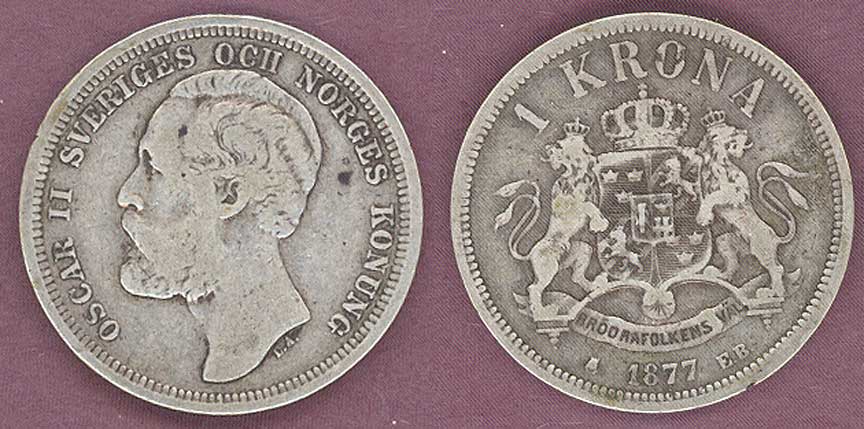 Item Number: SWE-30 Fine+ 1877 EB #747 .800 Silver - Original no problem coin. Ruler Oscar II 1872-1907.$55.00