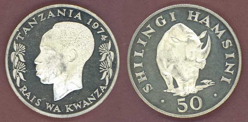 Item Number: Tanz-24 About Uncirculated+ 50 Shilingi .925 Fine Silver #8a Large 42 MM coin With Black Rhinoceros on reverse. Low mintage of only 12,000$80.00
