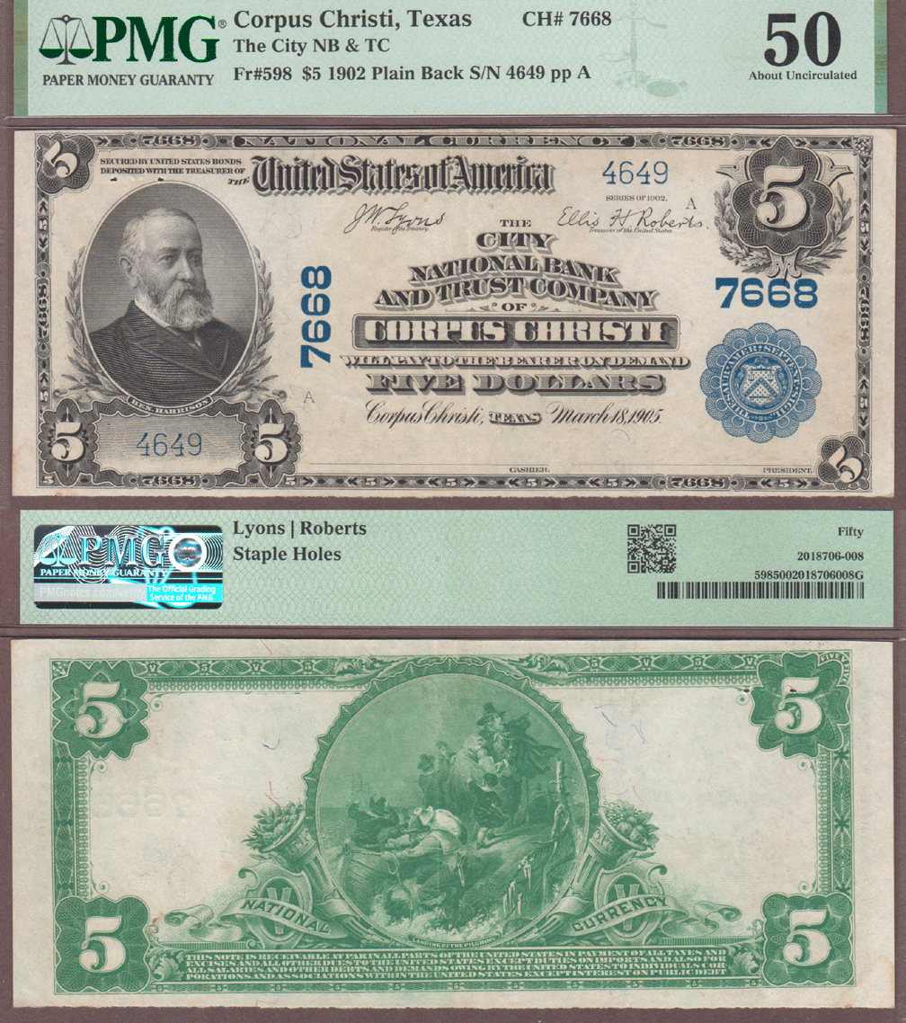 LNBN-112 PMG About Uncirculated 50 -Staple Holes- FR-598 Lyons/Roberts - The City National Bank and Trust Company of Corpus Christi - Nueces County Charter # 7668. CC, TX the sparkling city by the sea. Staple hole above portrait on this well margined National. As of 7-23 13 $5.00 FR-598 large size know from this bank in the T&P census. Only one graded higher a 55.