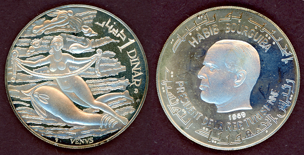 Item Number: TUN-25. Proof 63+ 1 Dinar .925 Fine Silver #299 Large 40 MM coin - Venus with the ribbon of love. The head of Habib Bourguiba facing left. Low mintage of only 15,000$55.00