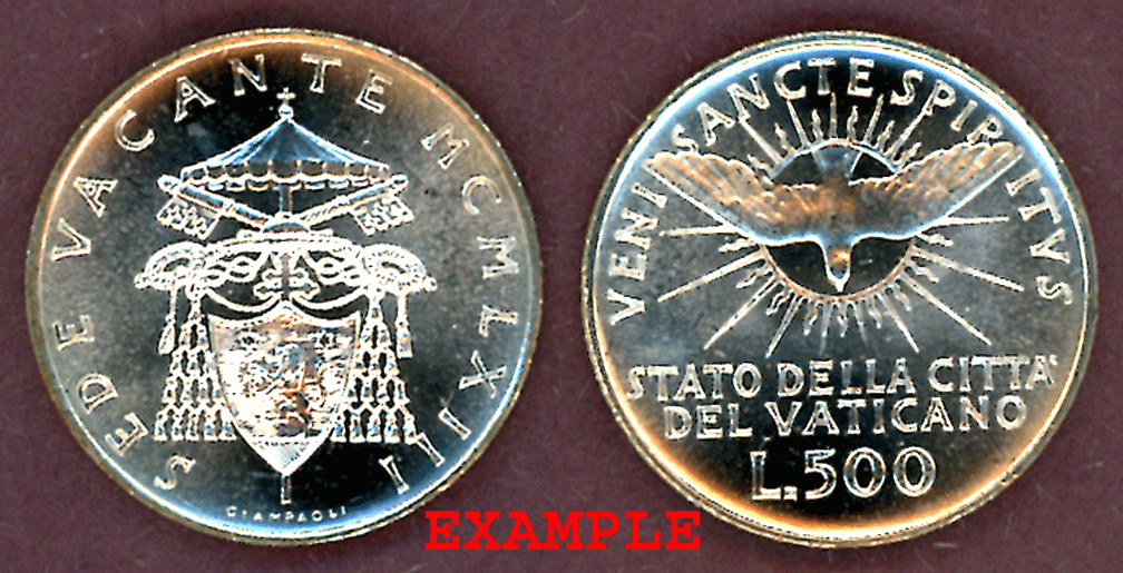 Item Number: VAT-50E Uncirculated - 500 Lire #56 .835 Silver Approximately 29 MM Arms of Cardinal Benedetto Aloisi-Masella. Made only 1 year 1958.$50.00