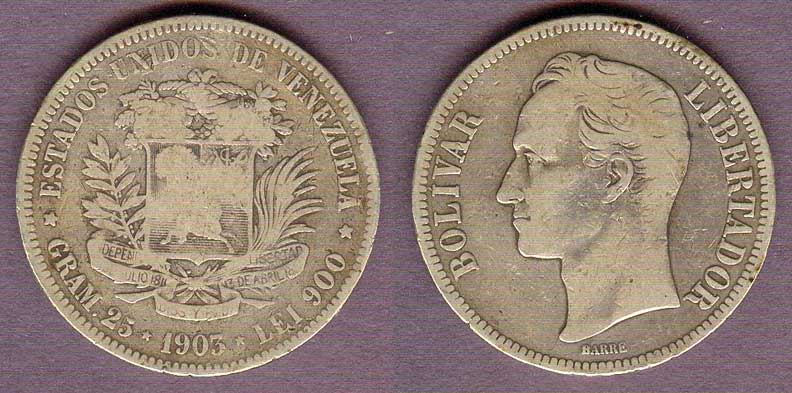 Fine+ 5 Bolivares KM#24.2 .900 Silver Large Silver Dollar size.