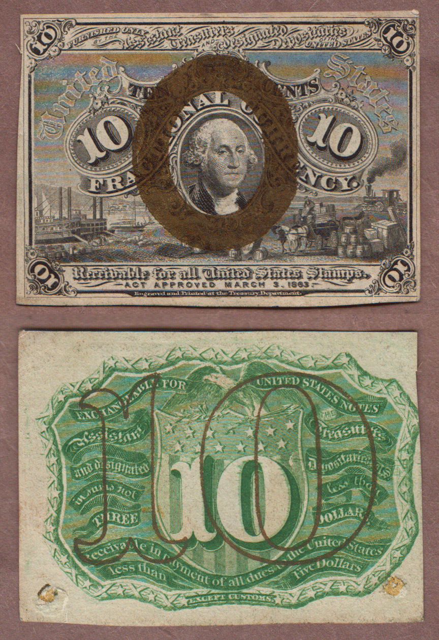 Item Number: FRAC-1244 About Uncirculated Details - FR-1246 Second Issue - Issued 10-10-1863 thru 2-23-1867 - Has a couple specks of glue on back at bottom corners. George Washington in Bronze oval frame. $70.00