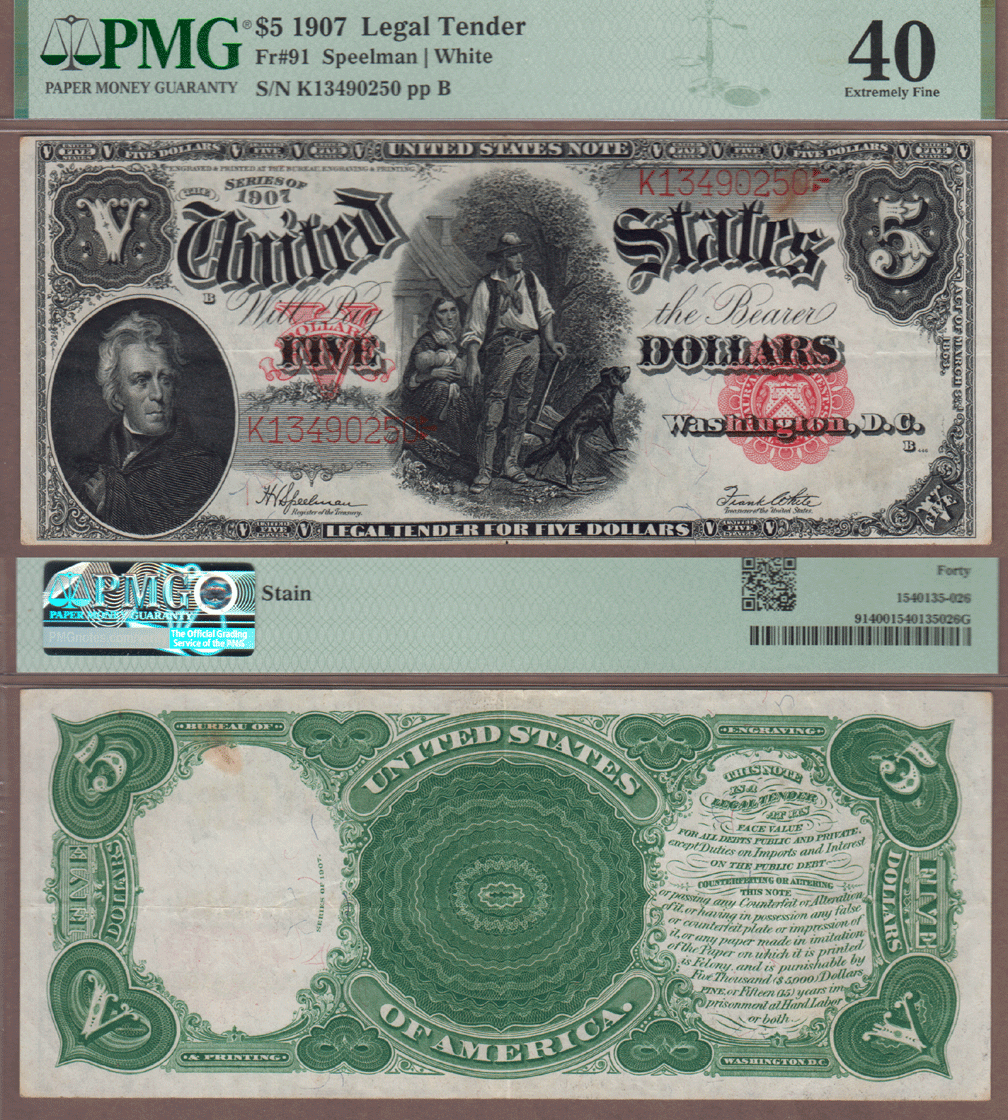 Item Number: LLTN-132 PMG Extremely Fine 40 - FR-91 Speelman/White - Attractive well margined Wood Chopper US Large Size Legal Tender Note. $485.00