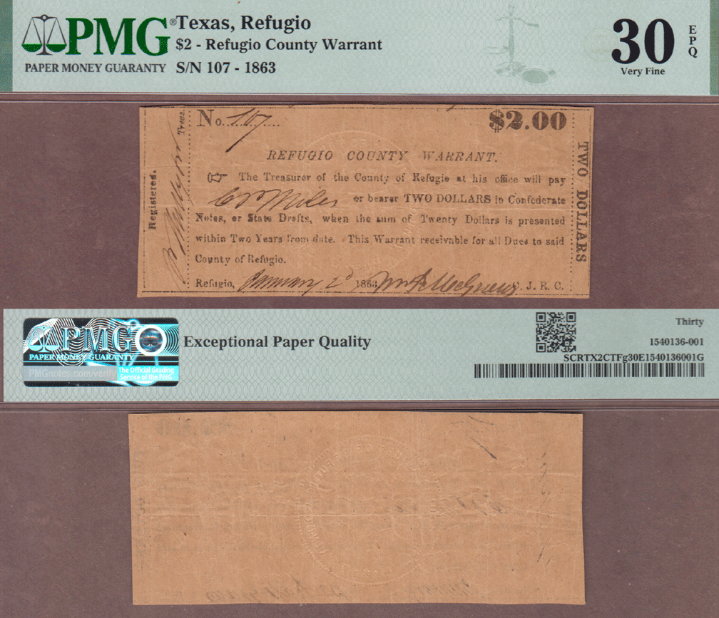 OBN-131 PMG Very Fine 30 EPQ - Refugio, Texas - Refugio County - 1863 Serial # 107 - Small size note Approx. 2" X 4-3/4" - Unlisted in the Medlar book. But I would guess it is a Rarity 7 with maybe 5 surviving population. Heritage offered a $2 Refugio note at auction 1/22 they state they knew of only one $2.00 note from Refugio. The one they offered PMG VF 30 serial #96 sold for $3360.00. This note is the same grade but with "EPQ" on the holder. You can also see the county stamp applied at center of note. Refugio County Warrant - Will pay the bearer $2.00 in Confederate Notes - "Rare note"