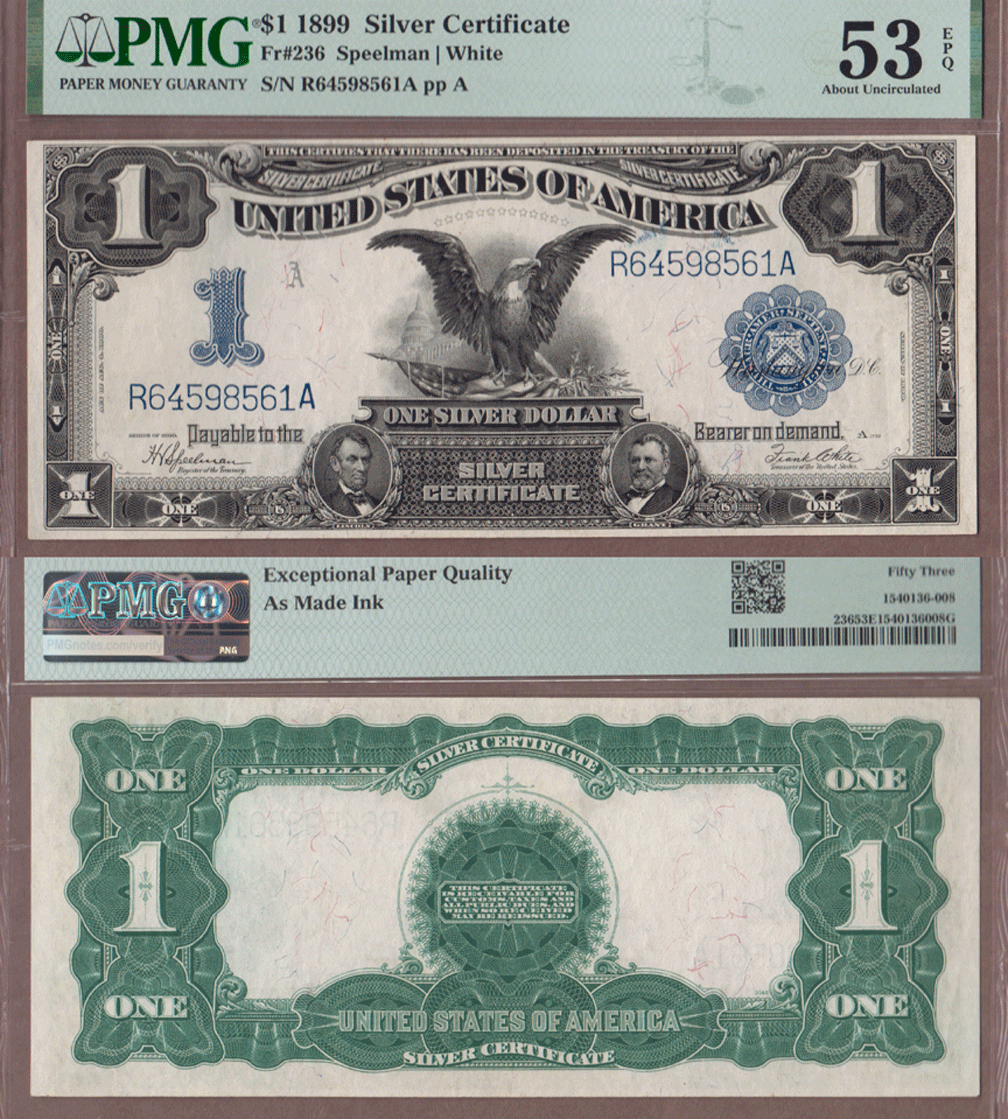 LSC-125 PMG About Uncirculated 53 EPQ - FR-236 Speelman/White - Black Eagle Large Size Silver Certificate. Portrait of Lincoln and Grant. Nice margins with clean bright paper EPQ (Exceptional Paper Quality). As Made Ink mentioned on holder (Small amount of blue ink above right serial #).