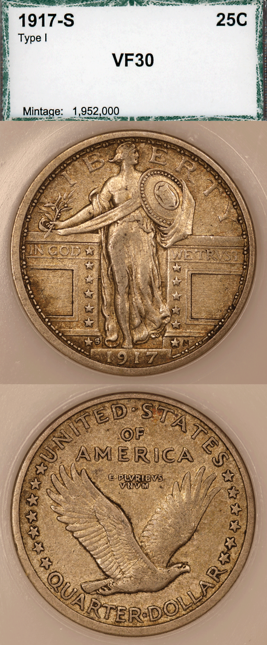 Item Number: SLQ-264 PCI Very Fine 30 - In green PCI holder. Sharp details high grade VF. Early San Francisco Mint Type-1 Standing Liberty Quarter. Mintage of only 1,952,000$180.00