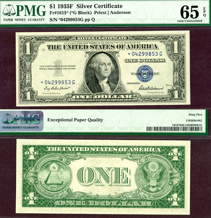 Item Number: SSC-184 PMG GEM Uncirculated 65 EPQ - FR-1615* Priest/Anderson - The *G Block is about 3X scarcer than the *F Block in GEM. Nice GEM with Exceptional Paper Quality. $95.00