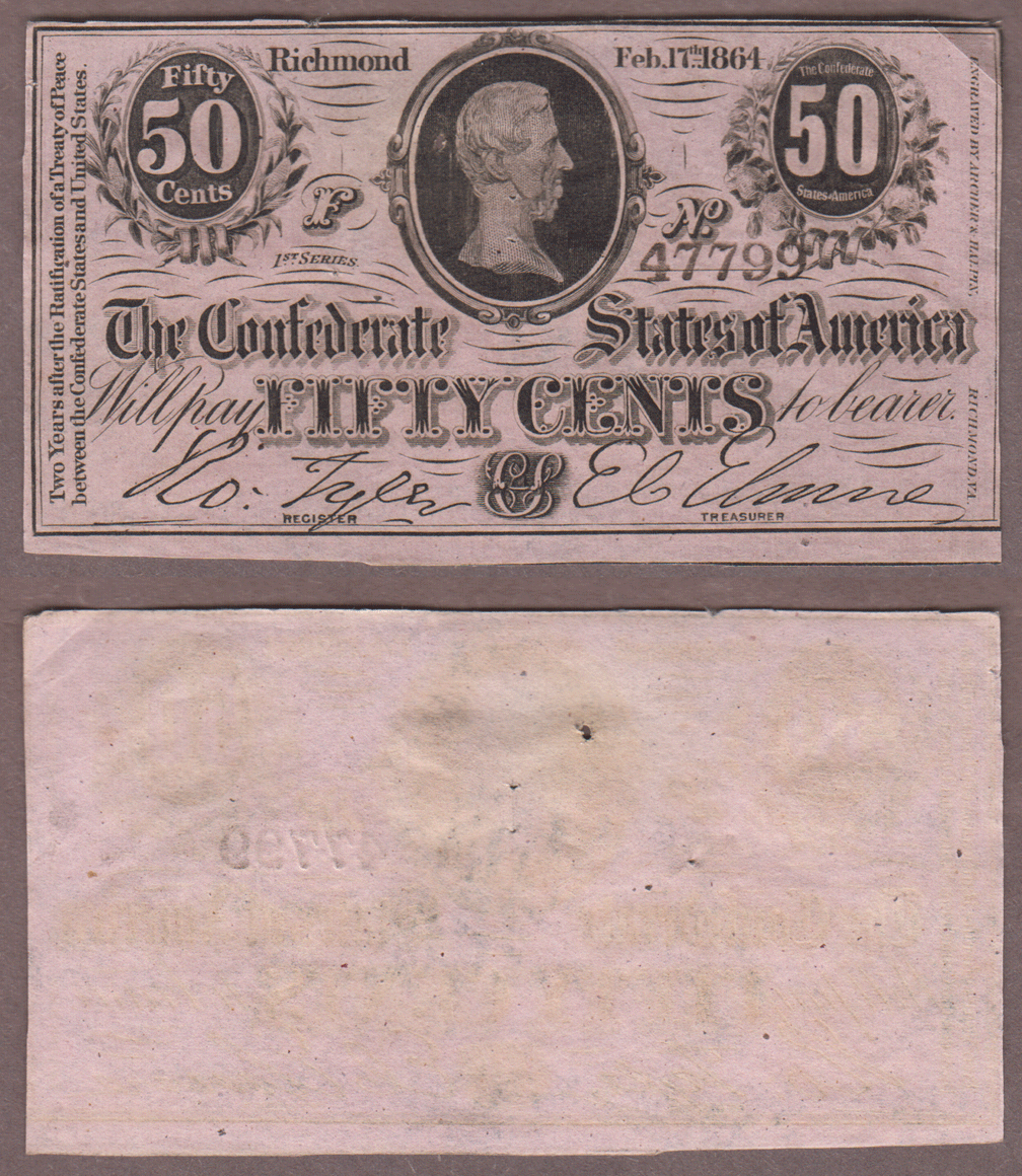 About Uncirculated - T-72 Richmond Feb, 17th 1864 1st Series F. Has a few pinholes. Profile of Jefferson Davis president of the Confederate States of America at upper center. Black printing on pink paper with a plain back. Smallest denomination issued by the CSA.