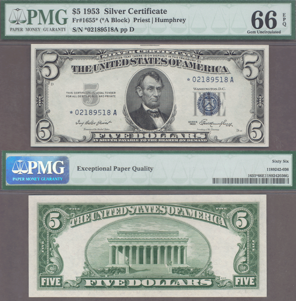 PMG Gem Uncirculated 66 EPQ - Priest/Anderson FR-1655* - Beautiful GEM+ $5 FR-1655* US Silver Certificate Star Note. Would be hard to improve on. As of 8/21 PMG has only graded 11 better