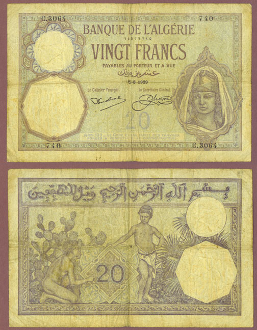 Item Number: ALG-29 Fine - #77 Large size note 6 1/2" X 4 1/4". 6-8-1929 Dull purple on blue underprint. Woman at right. 2 Youths with plants on back. Watermark: Draped head of woman and Arabic seal on.$25.00
