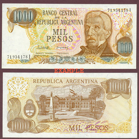 A-24E Choice Uncirculated - 1000 Peso #304 Front is brown on multi-colored underprint in beautiful pastel shades of green, lilac, and orange. Has portrait of General Jose de San Martin at right. Colored threads in paper. Back is brown on multi-colored underprint and has picture of the Plaza de Mayo in Buenos Aires at center.