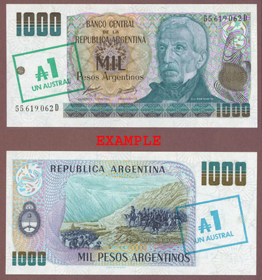 Choice Uncirculated - 1000 Peso ND series D #320 Front is very colorful with Blue-Green and brown on multi-colored underprint with portrait of General Jose de San Martin at right. Colored threads in paper and water marked paper. Back is a beautiful multi-colored underprint and has picture of the El Paso de los Andres battle scene at center.