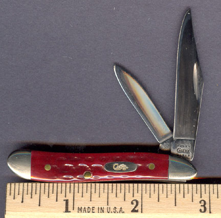 The very popular 2 7/8" Peanut Pocket Worn style with clip and pen blades. This knife has the popular Classic Red Jigged Bone Handle. Nickel silver bolsters and script style Case inlay shield. It is new in the box with case info insert and wrapped in the original brown paper. This knife is for the collector who wants the best mint condition knives they can find. Case made in the USA by American Craftsmen!