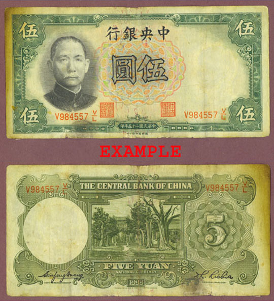 Item Number: CHI-27E Fine or better Large Size note #213 Dark green on multi colored underprint. Portrait of Dr. Sun Yat-Sen at left. Back is olive green with gateway and temple behind trees.$3.00