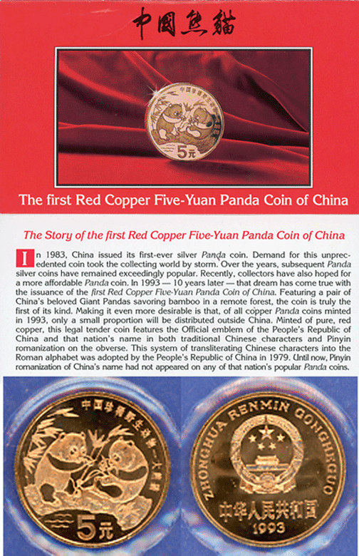Item Number: CHI-100E Uncirculated 5 Yuan #469 Copper Panda Proof sealed in original mint plastic mint informational folder. One Year Type Coin. Mintage of 2,000,000$40.00