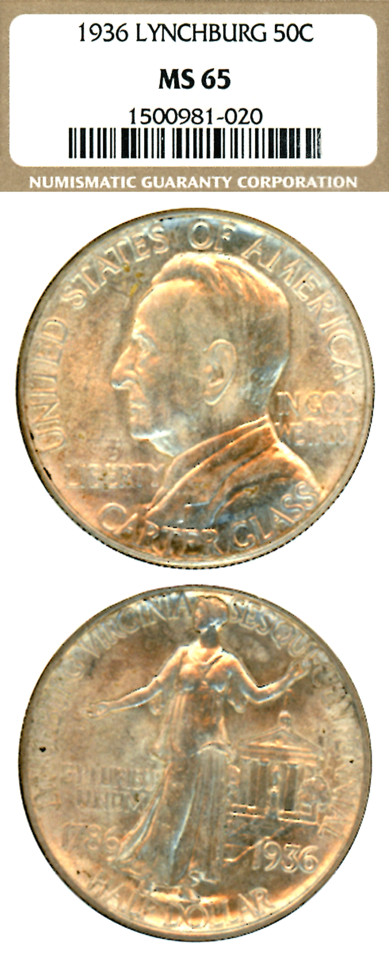 NGC Mint State 65 - Original surfaces with great mint luster. - Commemorating the Sesquicentennial of the city of Lynchburg. Portrait of Senator Carter Glass on obverse. Miss Liberty with old Lynchburg courthouse in background on reverse. Low mintage of only 20,013