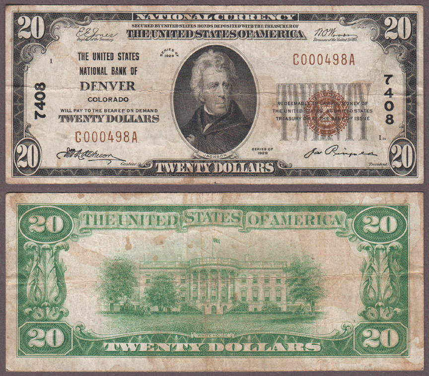 Item Number: SNBN-160 Very Fine - FR-1802-1 The United States National Bank of Denver Colorado - Charter 7408. Well margined with light staining$165.00