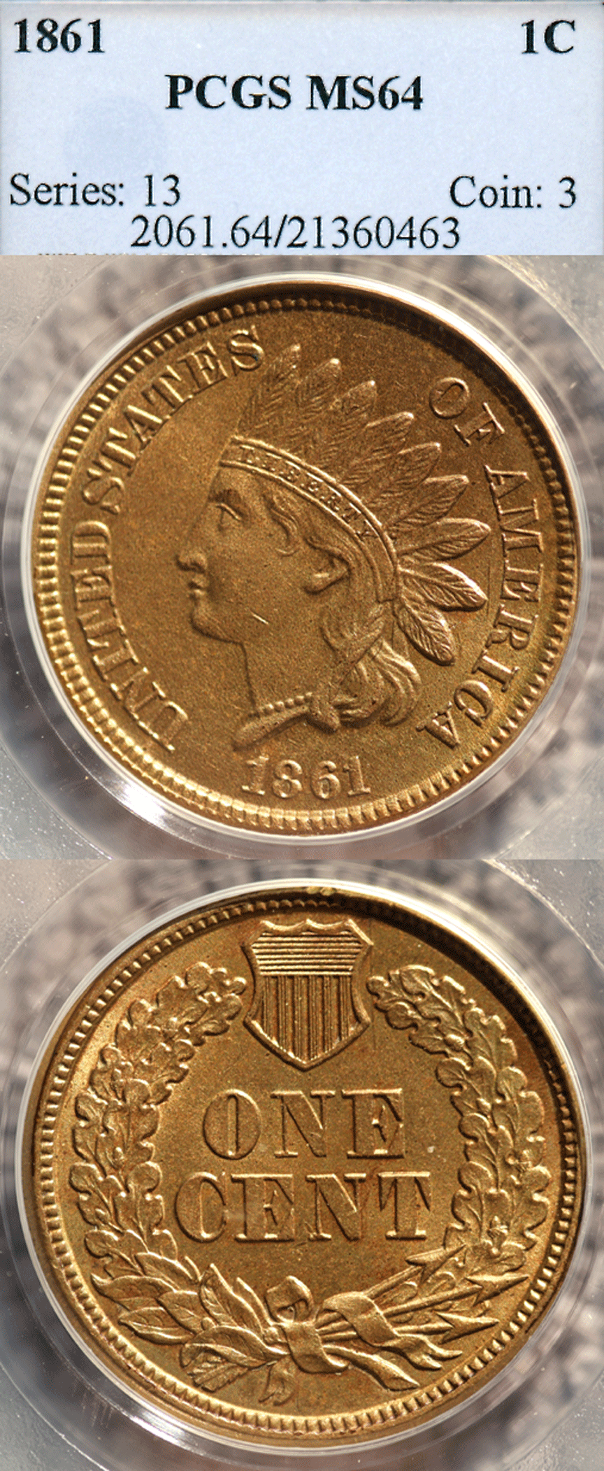Item Number: IC-353 PCGS Mint State 64 - Sharp details on Flashy clean surfaces. One hit on the cheek from a higher grade. The lowest minted of the Copper-Nickel (1859-1864) Indian cents. Mintage 10,100,000$775.00