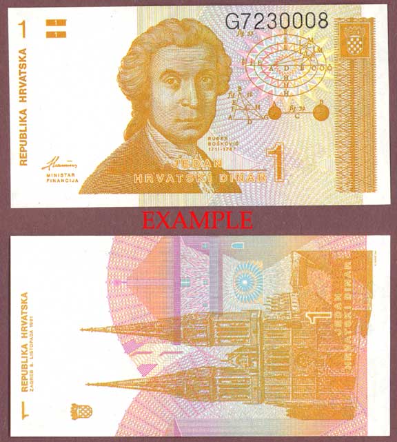 Item Number: CROA-23E Uncirculated - #16 Smaller note 4" X 2". Dull orange-brown on multicolored underprint. R. Boskovic at center with geometric calculations at upper right. Zagreb cathedral and artistic city buildings behind.$1.00