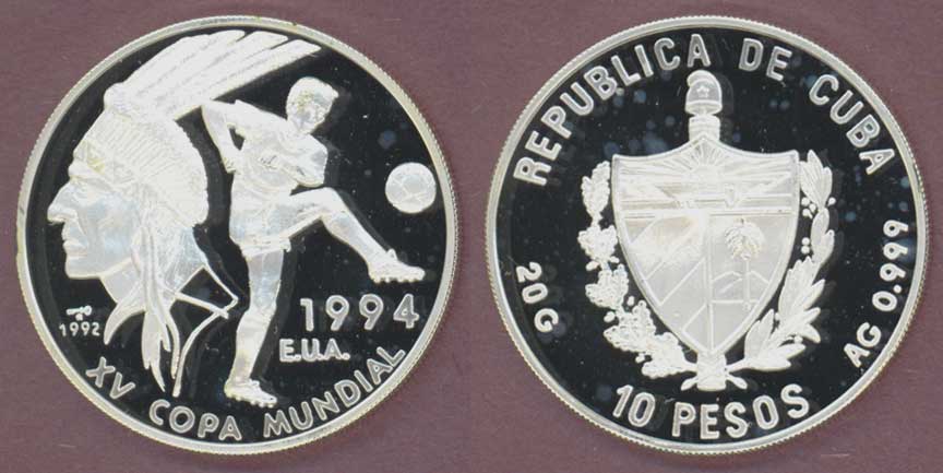 Item Number: CUBA-48 Deep Mirror Proof - .999 Silver #458.1 Ten Peso - World Cup Soccer with Indian in headdress at left and soccer player at right on reverse with National arms on obverse.$120.00