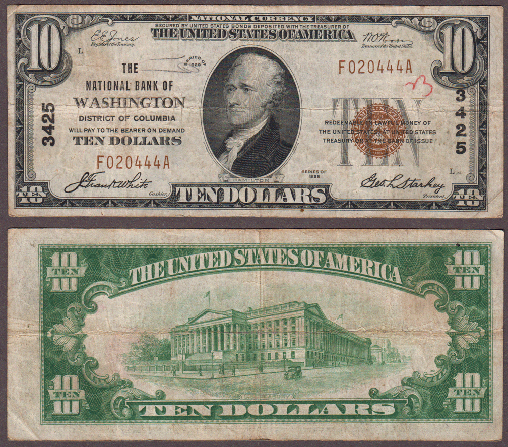 Item Number: SNBN-157 Fine - FR-1802-1 The National Bank of Washington District of Columbia - Charter 3425. Light ink & pencil marks on front of note. Type-1 National from our nation's capitol. $95.00