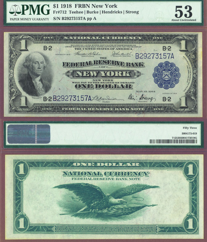 Item Number: LFRBN-33 PMG About Uncirculated 53 - Teehee/Burke & Burke/Hendricks FR-712 Green Eagle Large Size Note from the New York Federal Reserve Bank. Attractive example with nice centering and no problems. $350.00