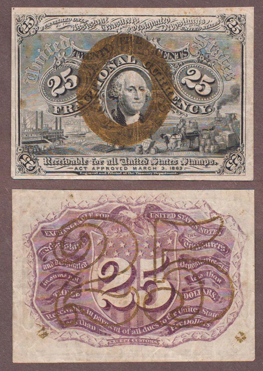 Item Number: FRAC-108 Very Fine - FR-1284 Second Issue - Issued 10-10-1863 thru 2-23-1867 - George Washington in Bronze oval frame. Good margins on all sides. This is the variety with surcharge 18-63 on purple back.$55.00